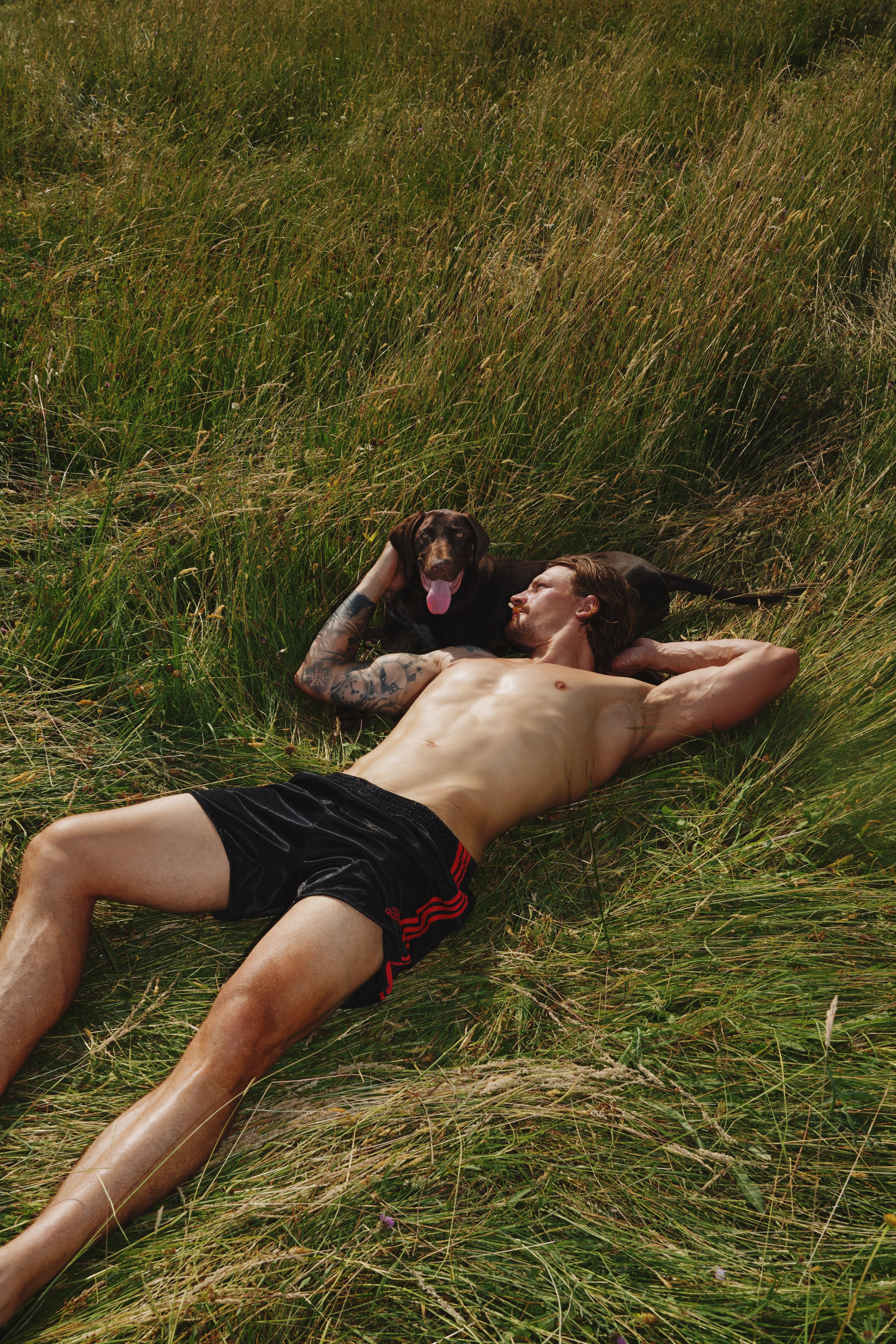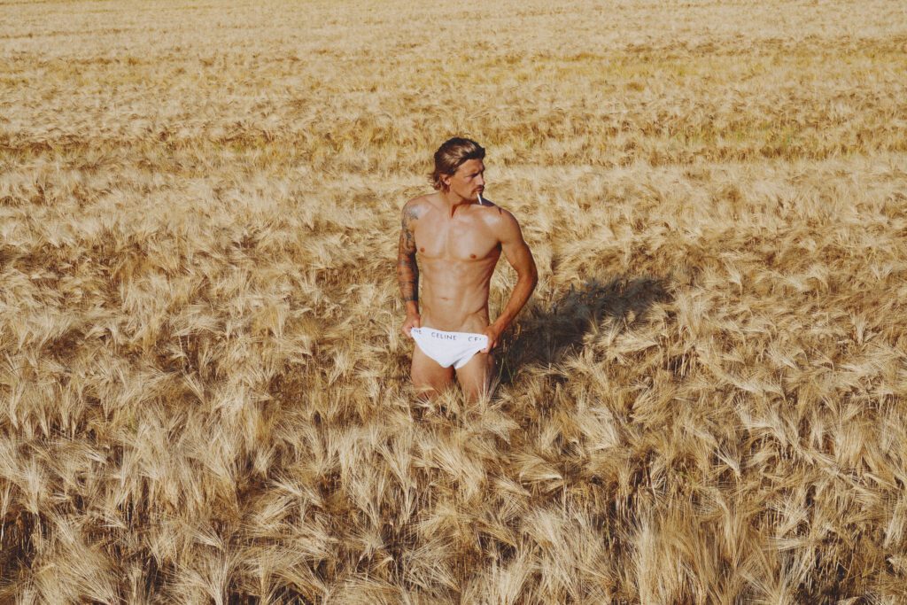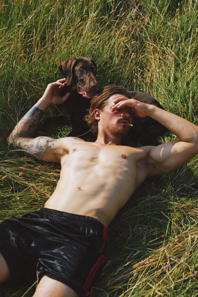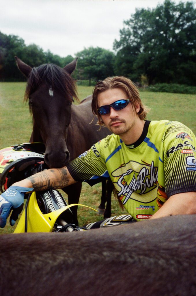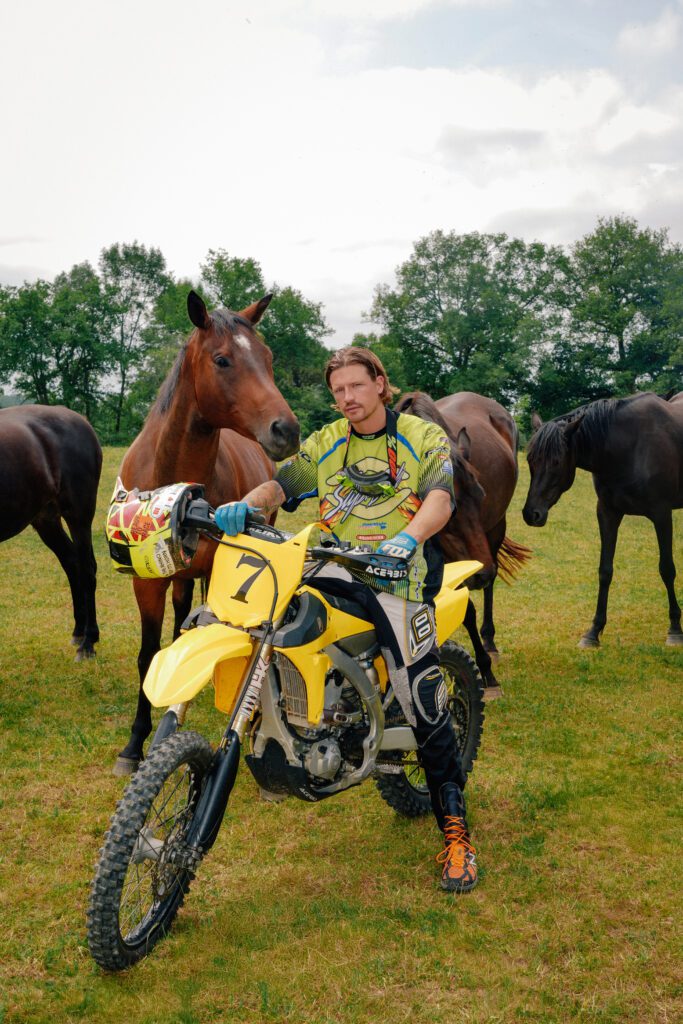 Shot in the sun-soaked fields of St-Martin-le-Pin, France, this editorial brings together model Bram van Adrichem and photographer Rogier Alexander in a raw, magnetic study of masculinity and freedom. Between horsepower and nature’s calm, Bram moves effortlessly from rugged motocross energy to intimate stillness — a modern-day nomad at ease in both chaos and quiet. The series celebrates physicality, independence, and the unfiltered beauty of life lived outdoors.