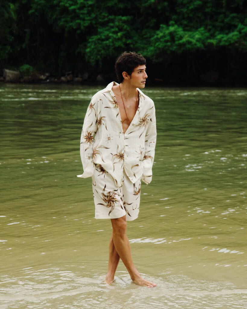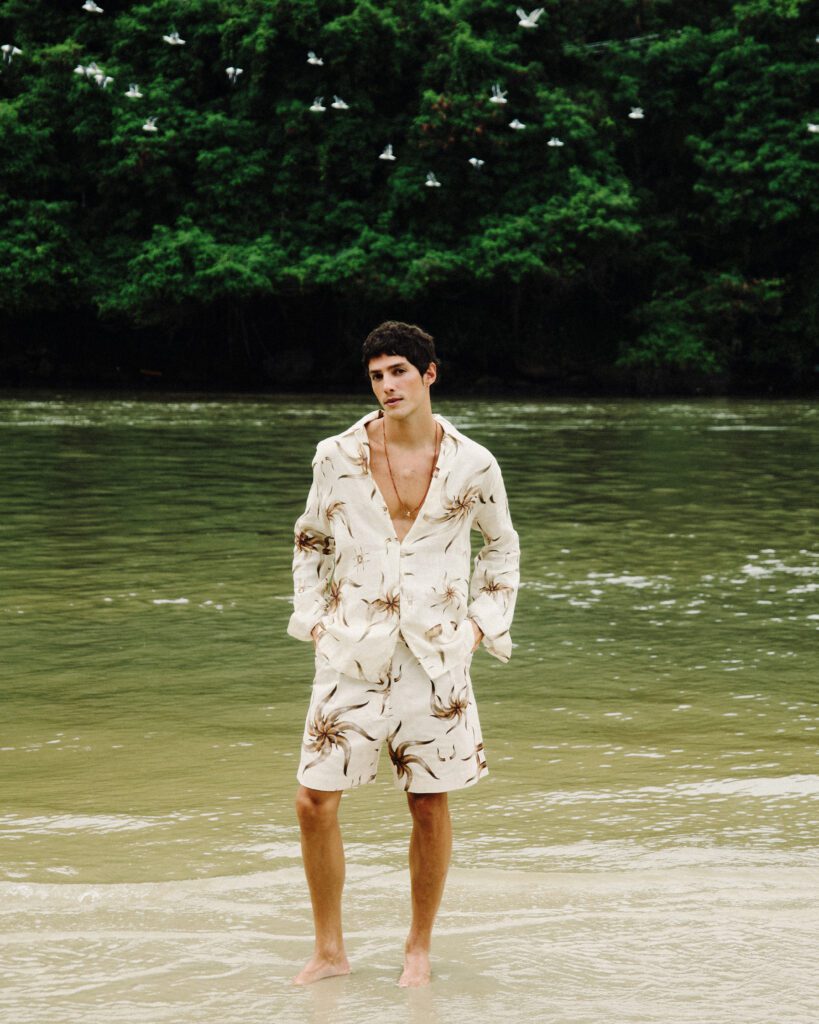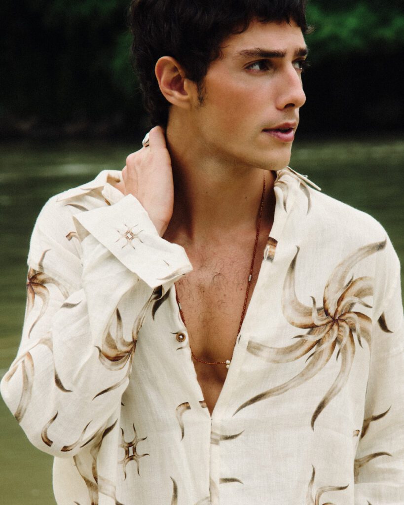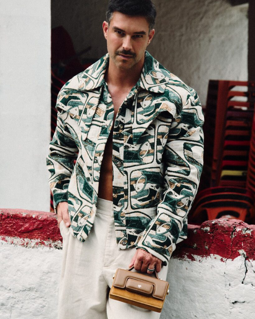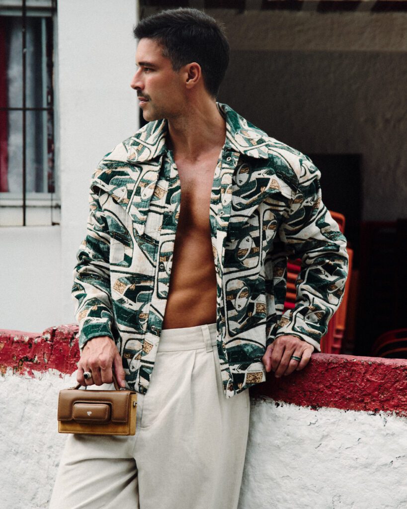Os looks escolhidos reforçam essa identidade. Em uma das imagens, Bernardo aparece com jaqueta estampada e calça clara de alfaiataria, acompanhadas por uma das bolsas desejadas da marca. Na capa, tons terrosos dominam a produção. Já no último look, uma camisa leve e estampada, usada de maneira despojada, acrescenta um ar sensual e leve ao editorial. O resultado é uma narrativa que traduz o estilo da MISCI: contemporâneo, brasileiro e sofisticado na medida certa.